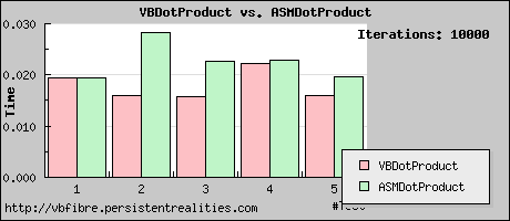 | VBDotProduct % faster than ASMDotProduct | VBDotProduct (sec) | ASMDotProduct (sec) |